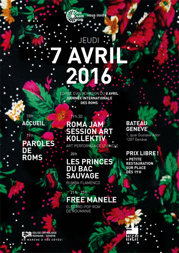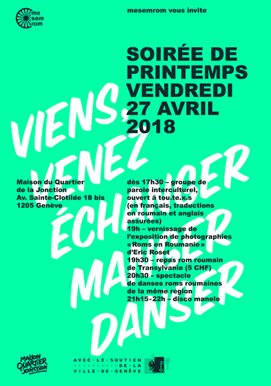 Rdv le 11 mars de 17h00 à 201h00, à la Haute Ecole de Travail Social, Batiment E, rue du Pré-Jérôme 16, Genève. Entrée gratuite - apéro en prix libre - bénéfices reversés à Mesemrom.