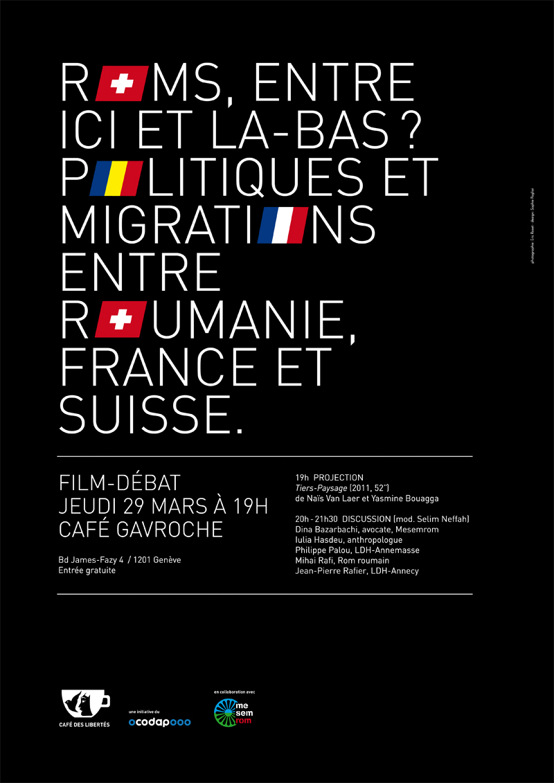 Café des libertés organisé avec le CODAP. "Roms, entre ici et là-bas ? Politiques et migrations entre Roumanie, France et Suisse". Projection du film Tiers-paysage à 19h, suivi d'un débat avec le public en présence de spécialistes invités.
